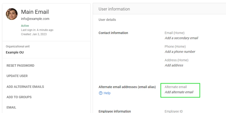 In the user’s editing screen, go to User information and click on Add alternate email in the Alternate email addresses (email alias) section.