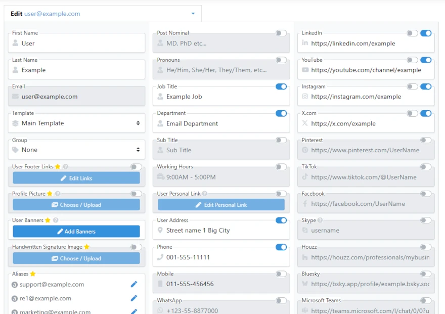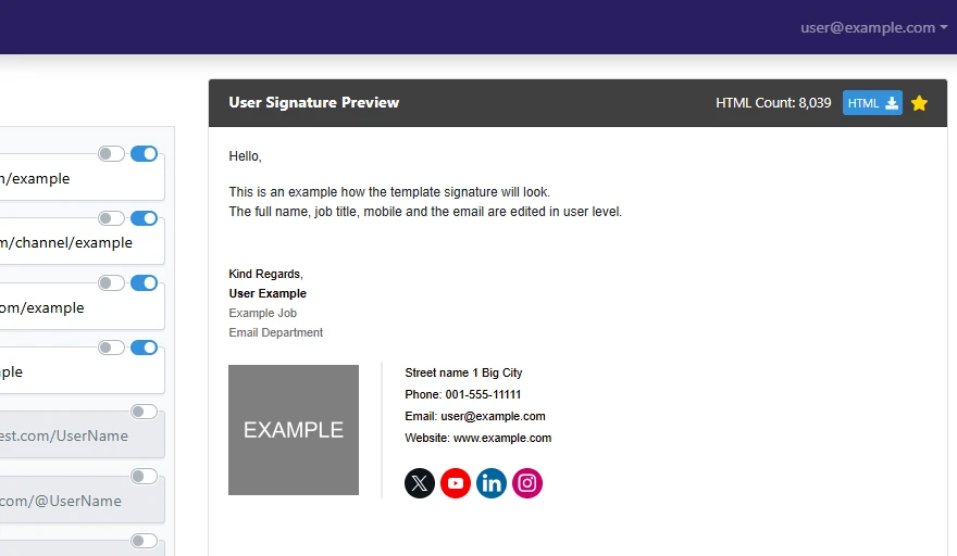 On the left you’ll see all relevant fields you can add and change for the user’s signature
