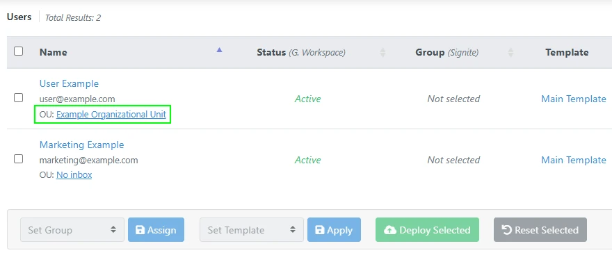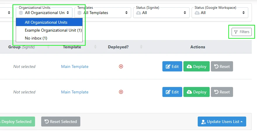 After verifying all the Organizational Units listed in the sidebar are accessible to Signite, go to your Users screen on Signite, and re-deploy the signatures for users you’ve had trouble deploying to.