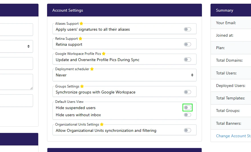 To hide your suspended users, check the Hide suspended users checkbox in the Default Users View area of the Account Settings section.